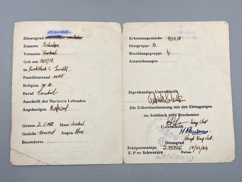 Frontline Field Issue German Army Kenkarte Feldwebel Gerhard Schulze