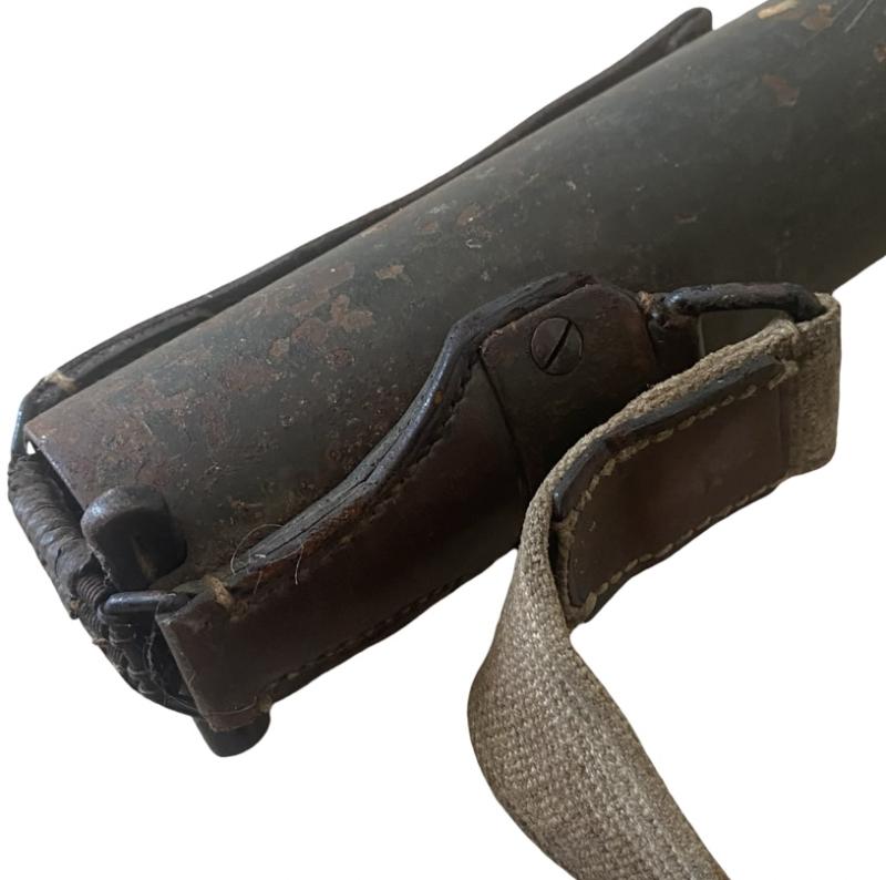 Original WW2 German MG13 machine gun barrel case. Complete with wartime strap and leather pulls. Marked B32 on the casing. In good unused condition with majority of original paint remaining. No WaA marks or dates appear present.