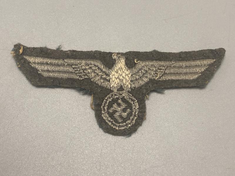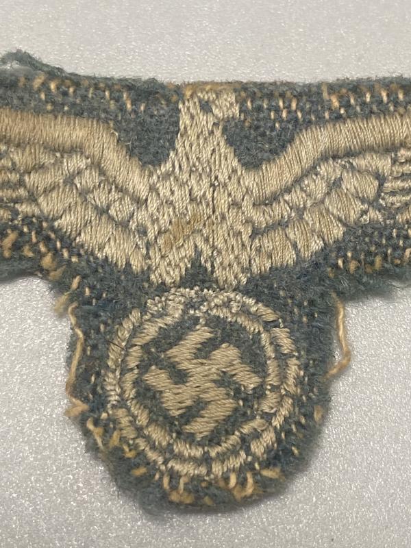Original German Army breast eagle made in occupied territory. This is a design new to me however has the correct age and construction to be correct for the period. A nice uniform removed item.