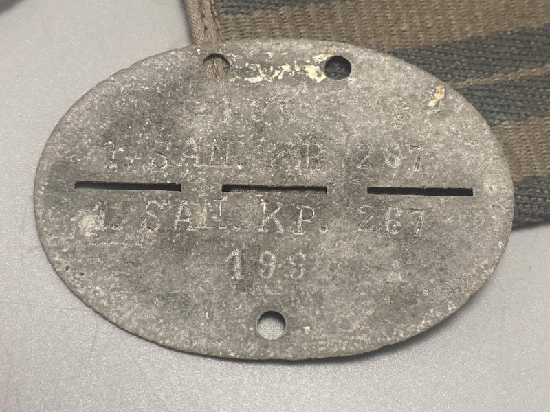 Original WW2 German ID disc and pouch issued to a soldier of San.Kp.267 (Sanitat Kompanie 267). Zinc ID disc with cotton pouch.