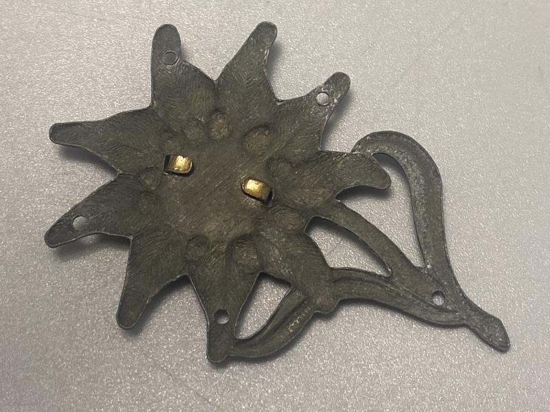Original Zinc German army Gebirgsjager edelweiss insignia. In good overall condition.