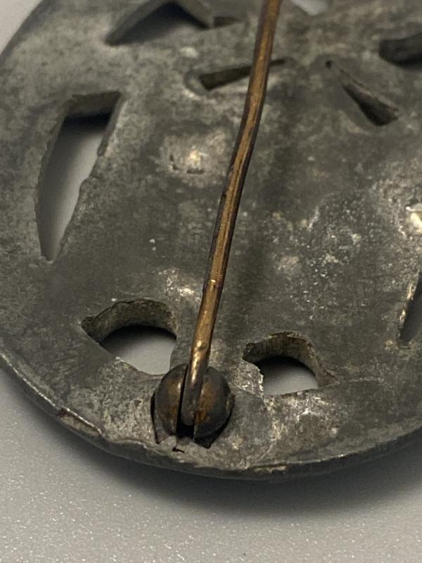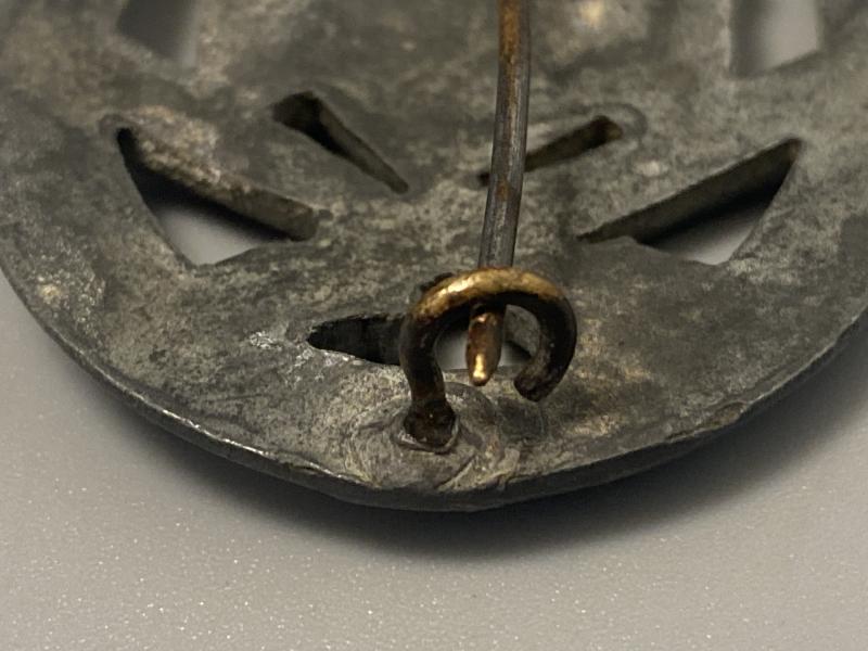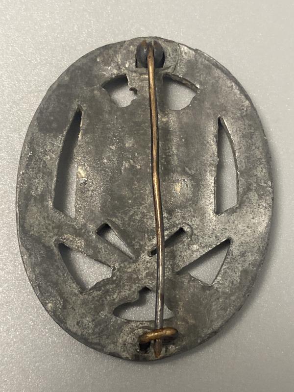 Original silver grade General Assault Badge manufactured by Rudolf Karneth. Made of zinc, this award carries the crude die flaws expected by this maker on the reverse. Complete with factory applied pin, hinge and hook.
