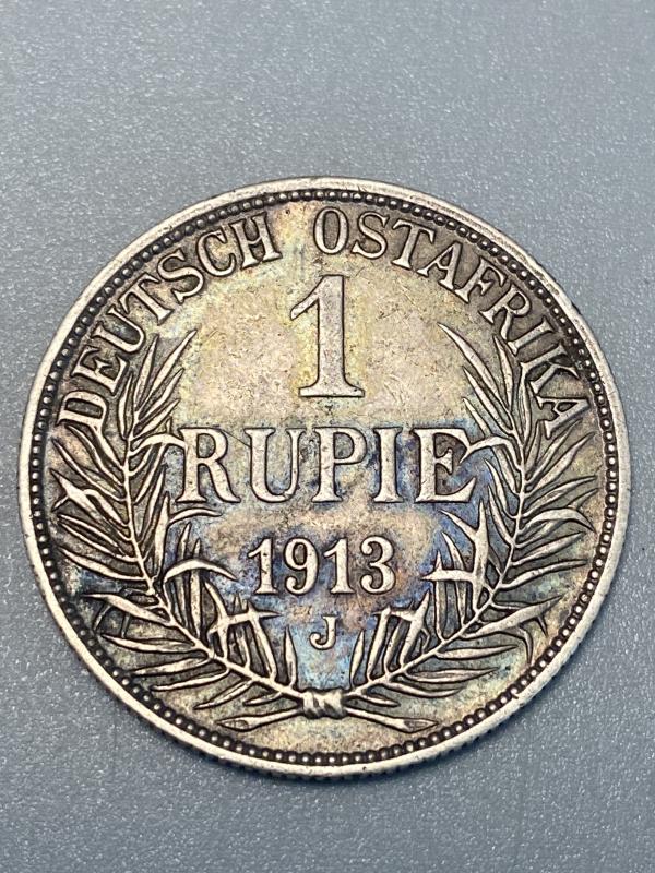Original Silver 1 Rupee coin manufactured 1913 and issued to German East Africa of the former German Empire. A rare coin. Ungraded.