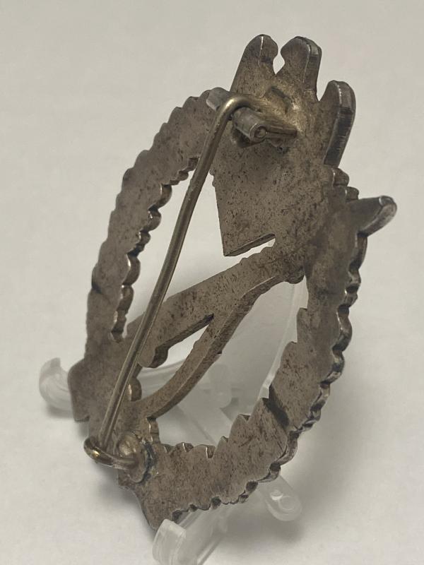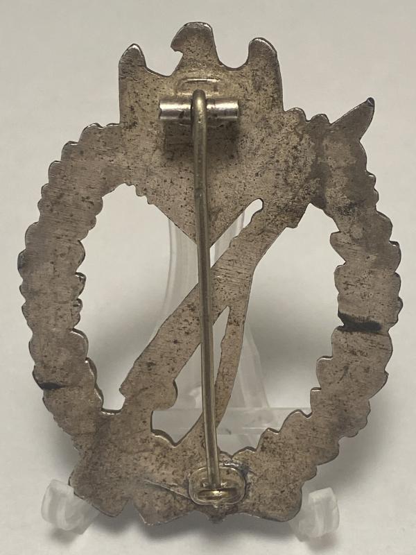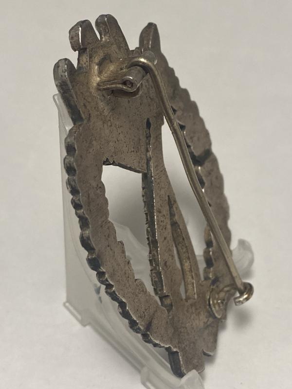 Original German Infantry Assault badge in silver manufactured by Schuco. Nice well made badge with high finish present. Complete with the original pin, hinge and hook.