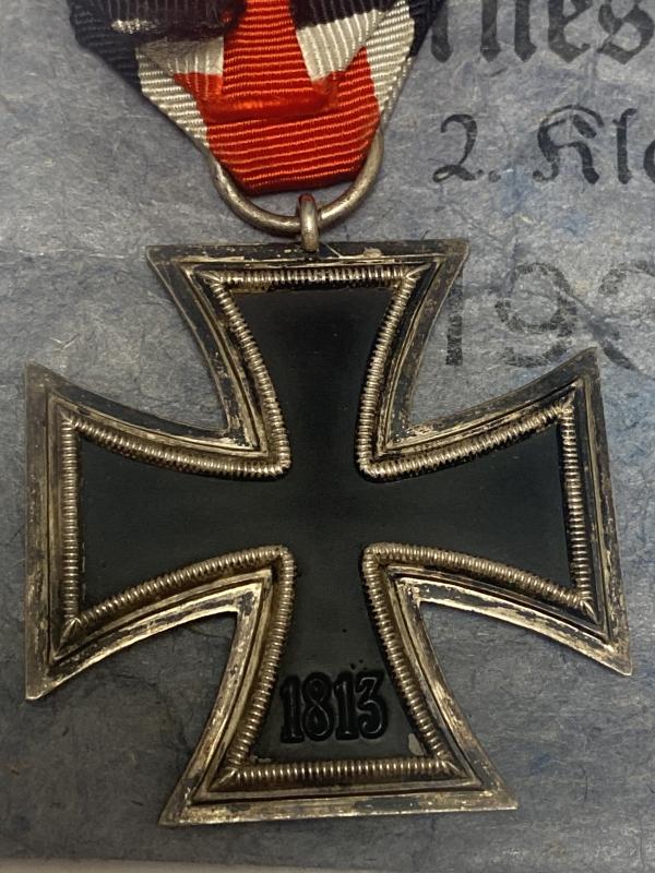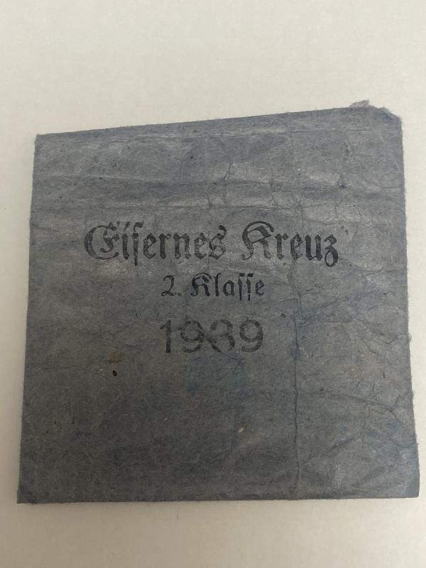 Original Iron Cross second class with ribbon complete with packet, produced by Richard Souval. A nice original pairing. Cross ring is unmarked however the award is produced by the factory.