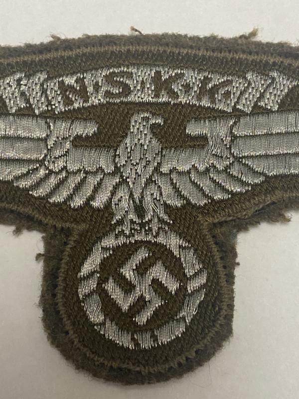 Original unissued NSKK (National Socialist Kraft Korps) flatwire sleeve eagle on wool backing. In perfect unused condition.