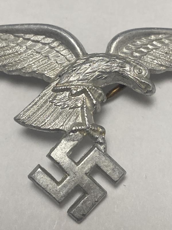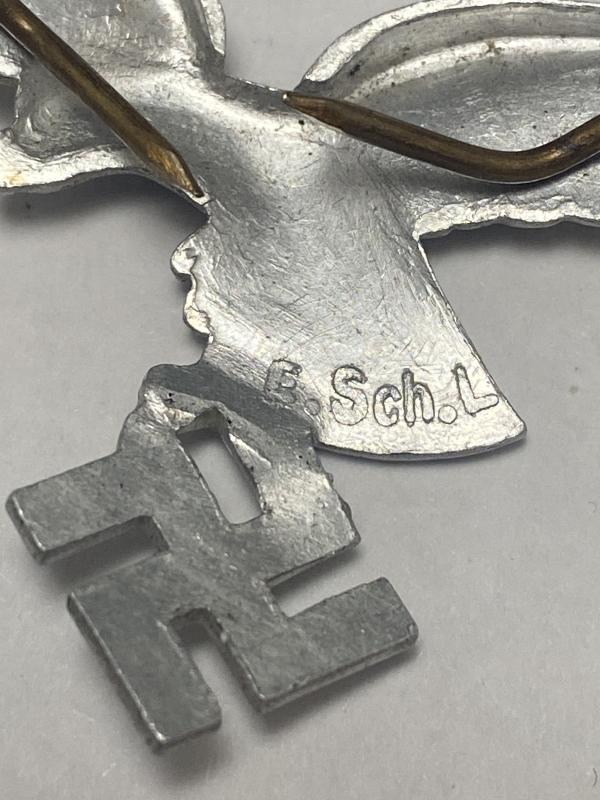 Original Luftwaffe Enlisted man Aluminium cap eagle made by E.Schneider of Ludenscheid. In good condition with both pins present on the reverse. Design slightly vaulted on the wings and emblem.