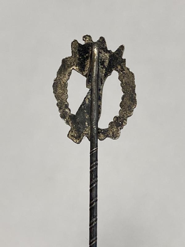 Original WW2 silver infantry assault badge stick pin. Good amount of finish remaining present. Typical twisted design on the pin.