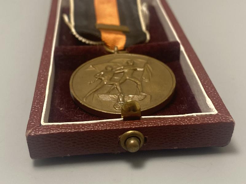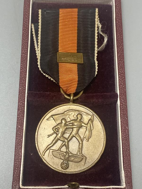 Original German Sudetenland campaign medal complete with box. Award with orange ribbon and small Prague bar as normally worn with the ribbon bar. Box in good shape.