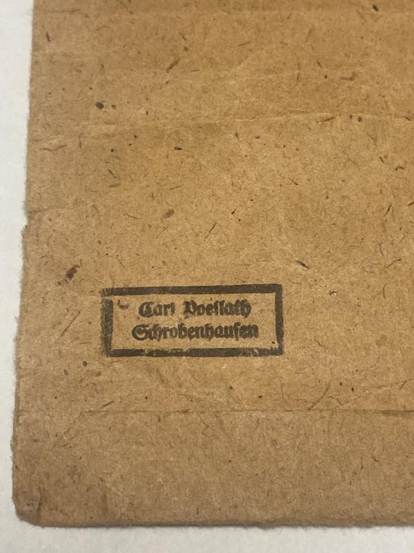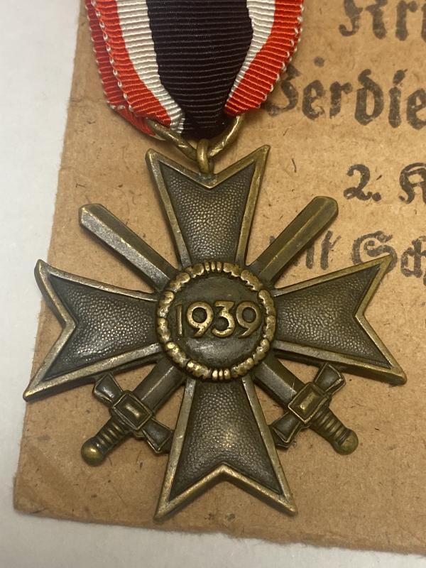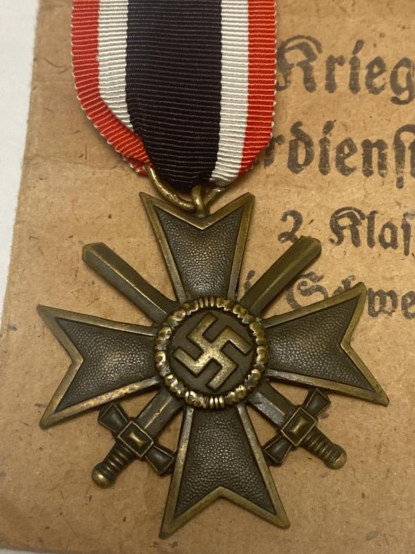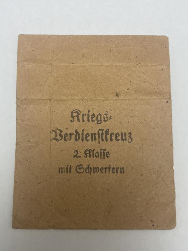 Original KVK2 award with packet produced by Carl Poelath. Award made of Tombak with no makers mark. Award has a misshaped ring, likely from previous mounting. Packet stamped with the factory name on the reverse.