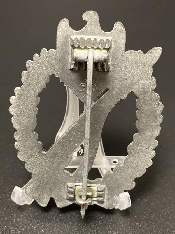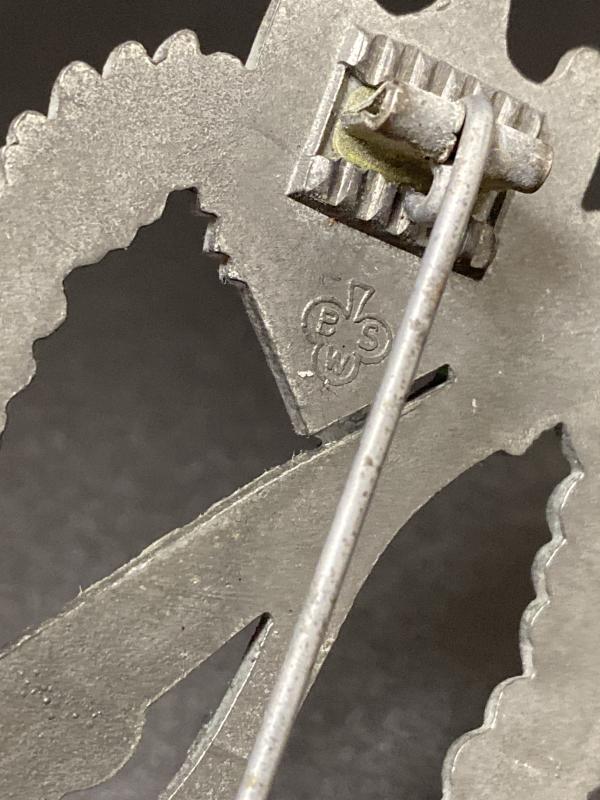 Original Silver Infantry assault badge made by BSW. Rare Crimped hinge and hook example. A nice badge.