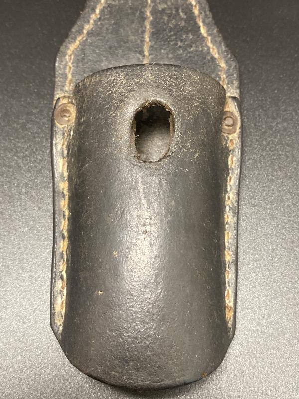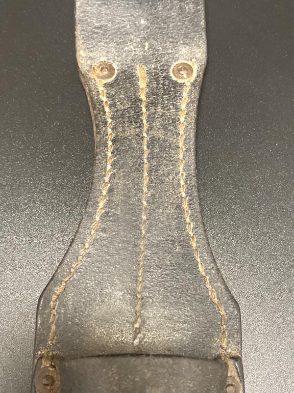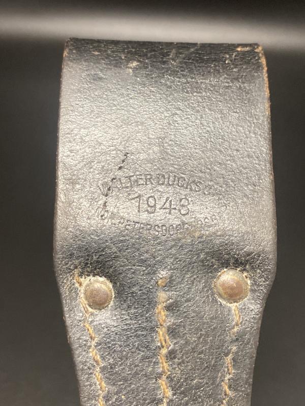 Original mid war German black leather K98K frog made by Walter Ducksch in 1943. In good used condition. Nice soft leather.