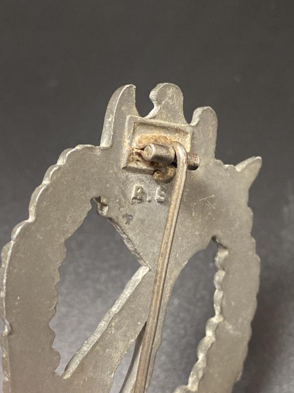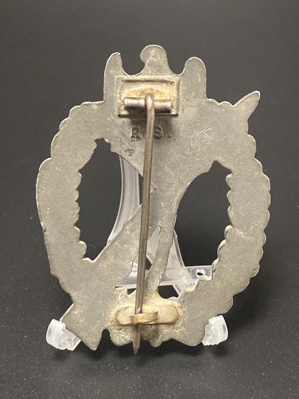 Original Silver Infantry Assault Badge maker marked for Rudolf Souval. A rare variant of this badge. In good condition with factory applied hardware. Hard worn piece, without silver wash.