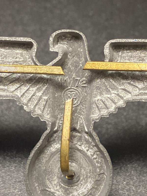 Original NSDAP Reichadler cap eagle maker marked M1/72 for Fritz Zimmermann. Eagle made of zinc with silver finish. A high proportion of this finish remains. All pins are present.