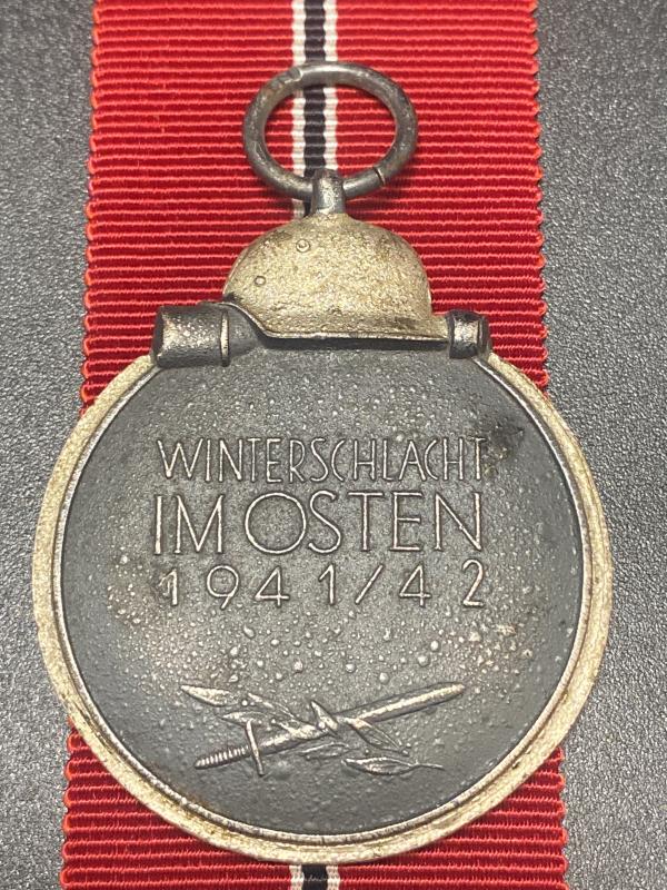 Original maker marked Eastern front campaign medal manufactured by Ferdinand Weidmann. Complete with short ribbon. Typical blistered finish as expected by this maker.