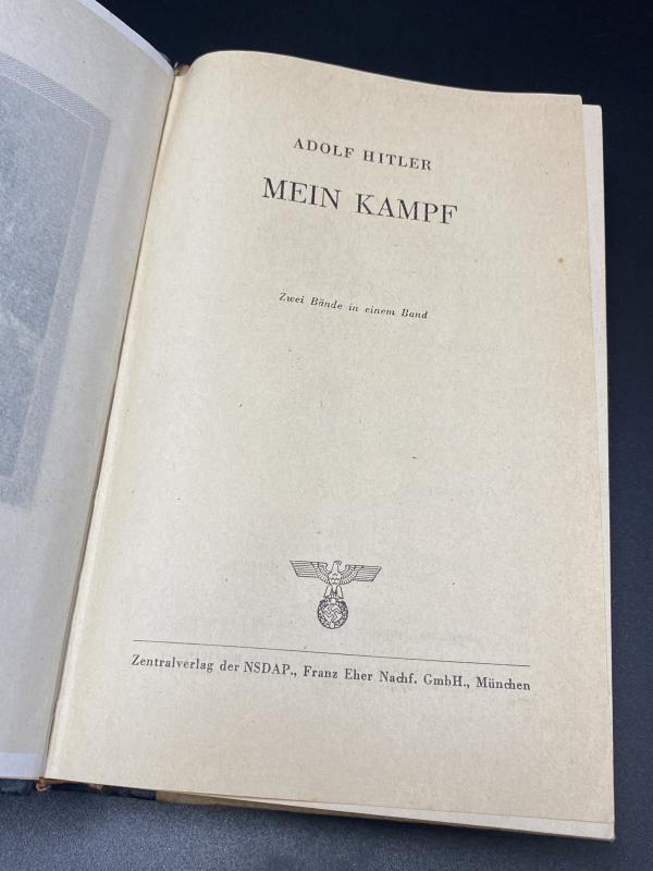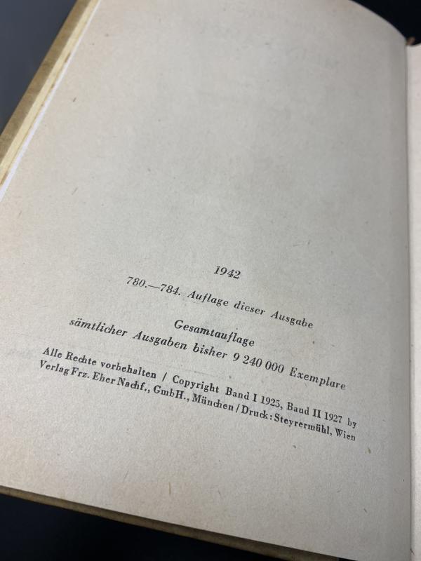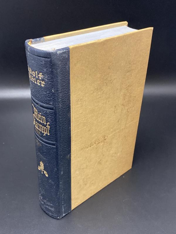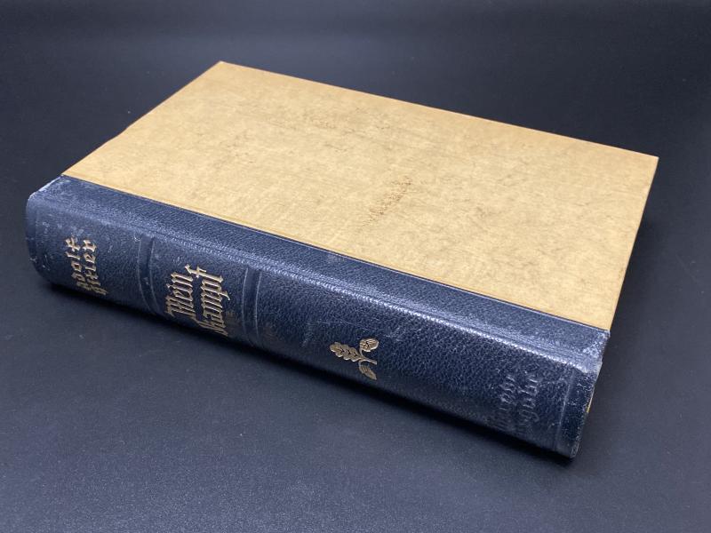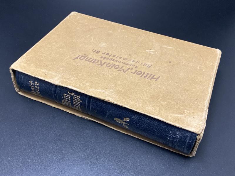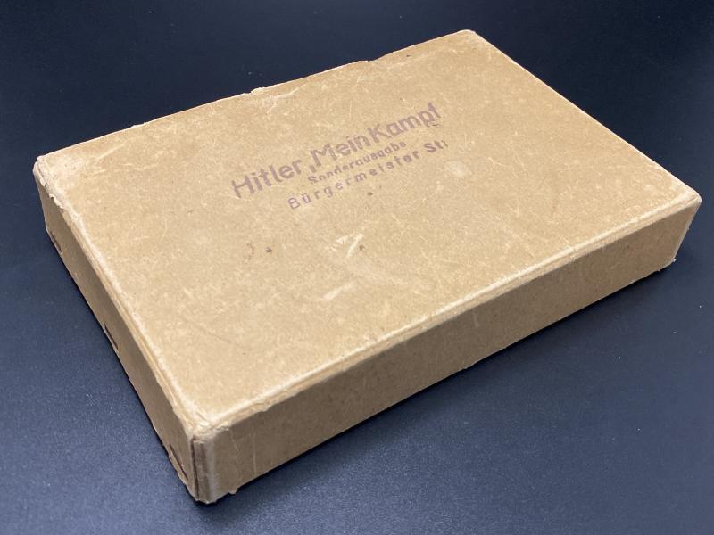 Original print of Adolf Hitlers “Mein Kampf” along with card case. A nice condition presentation piece issued by the Mayor of Bad Ischl, Austria on 16th December 1944. Book printed 1942.