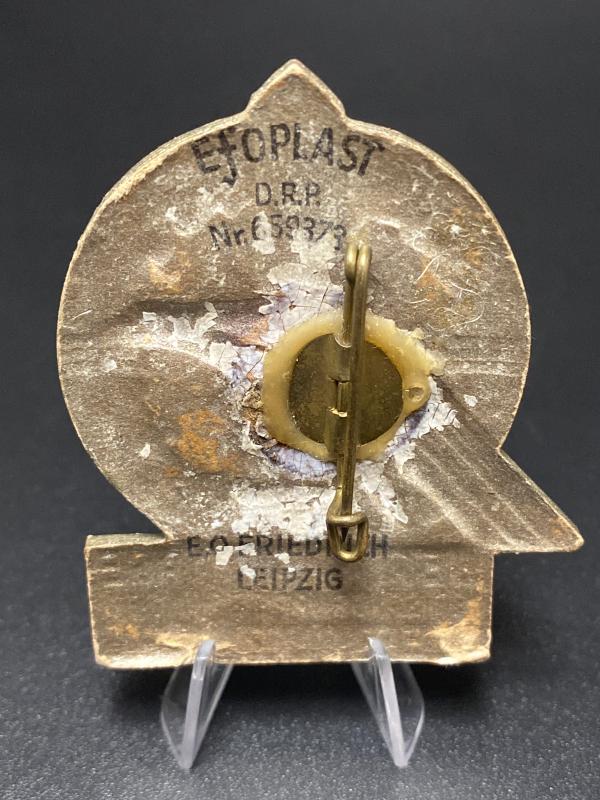 Original SA day badge made of compressed paper. Complete with pin. Maker marked E.O.Friedrich Leipzig with DRP patent number.