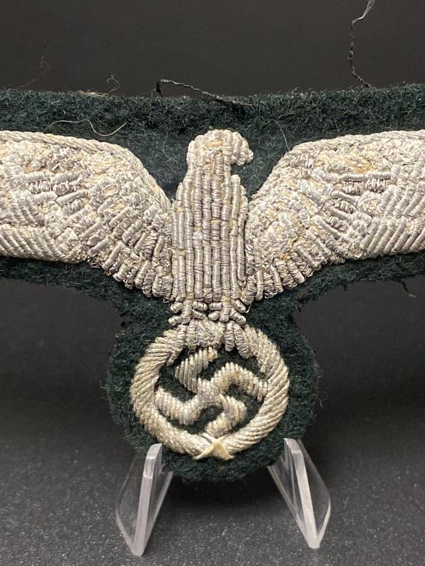 Original uniform removed Heer officers bullion wire breast eagle. Minor oxidation, too left wing with a bit of the wool backing missing.
