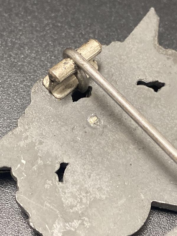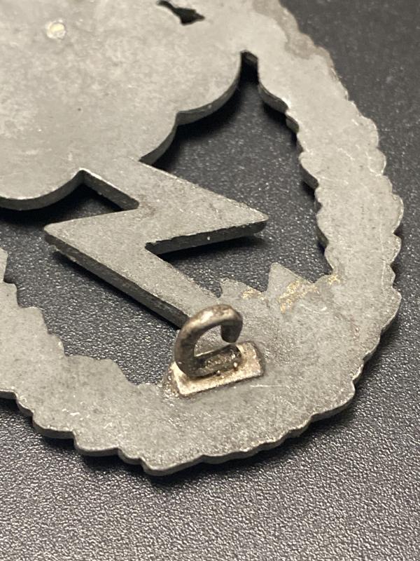 Original unmarked zinc Luftwaffe Ground Assault Badge produced by JE Hammer & Sohn. Two price construction with river fitted eagle. Typical factory assembled hardware on the reverse. Hard to upgrade.