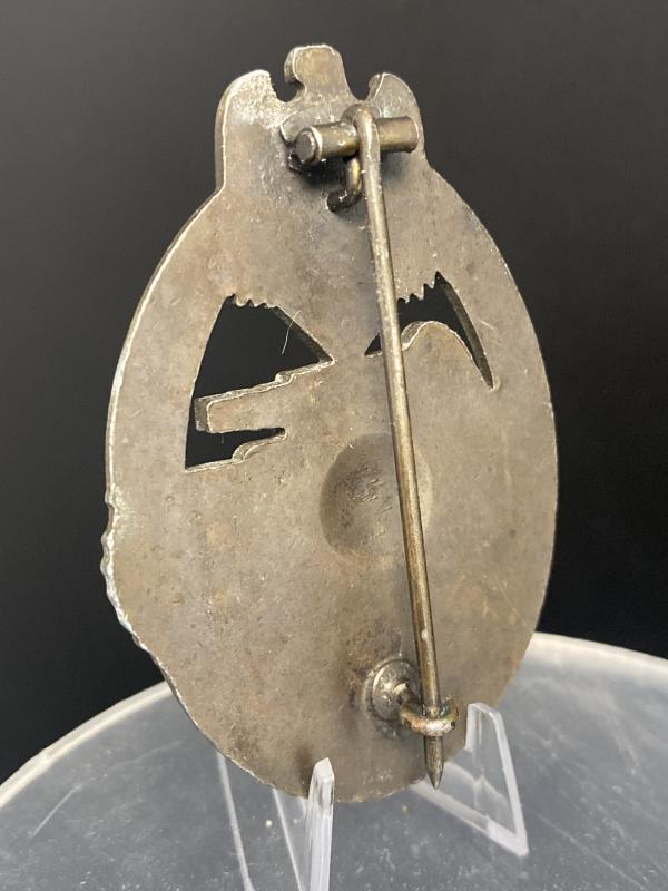 Original Bronze grade Panzer Assault Badge made by an unknown maker. Well known variant with the “Dish Back”. Complete with factory assembly hardware on the reverse. Good amount of original finish present.
