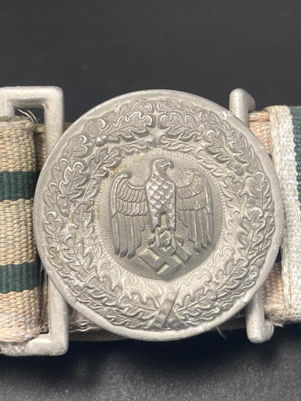 Original German Heer officers wire brockade belt & Buckle set. Belt is hard worn with some fraying. Buckle and aluminium fittings ok for age however small signs of corrosion. A nice sleepy set that’s been together forever. A nice cheap display piece.