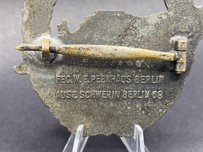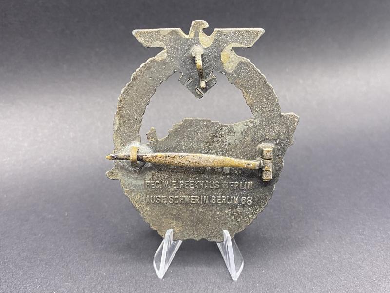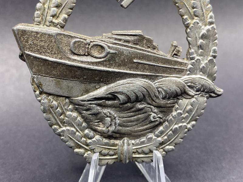 Original mid-late war period Kriegsmarine E-Boat badge manufactured by Schwerin of Berlin. Superbly made from a desirable maker. Badge in very good condition with gold wash on the wreath absent.