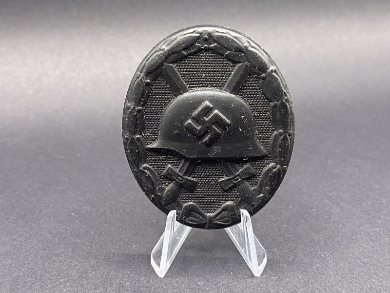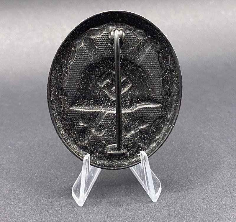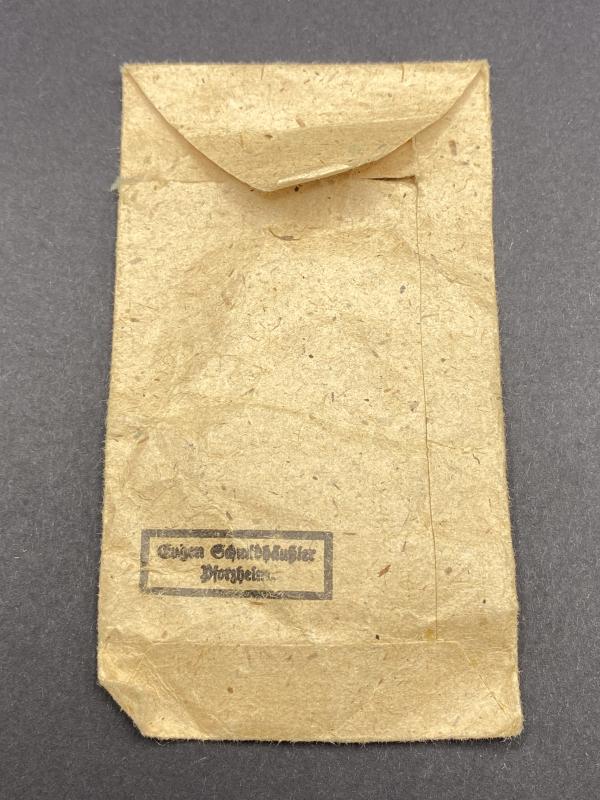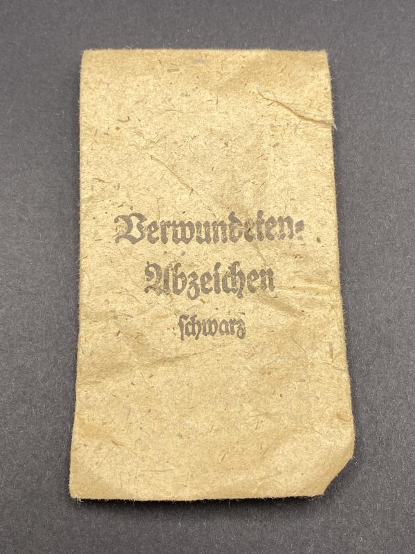 Original unissued Black grade wound badge produced by Eugen Schmidthaussler. Award complete with original paper packet. Badge marked E.S.P. Badge may have traces of paper on it due to storage. A nice item. Rarely found in the packet.