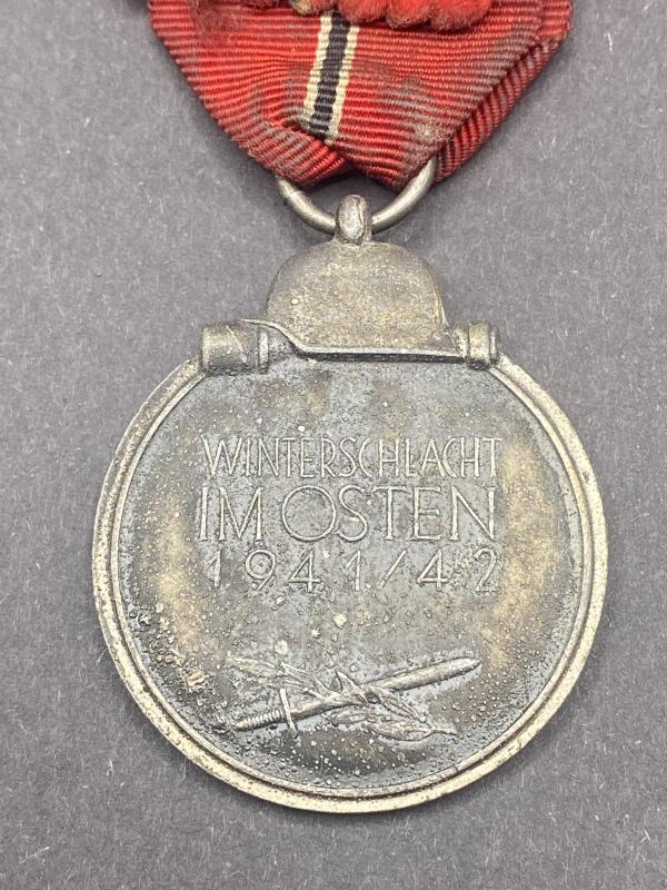 Original Eastern Front campaign medal maker marked 76 for Ernst Muller. Complete with ribbon. This example does not have any of the die flaws often encounter by this manufacturer.