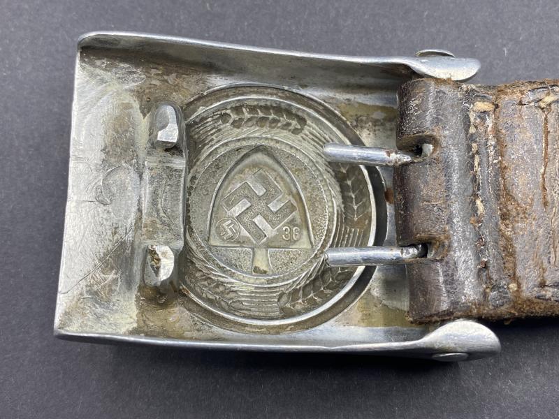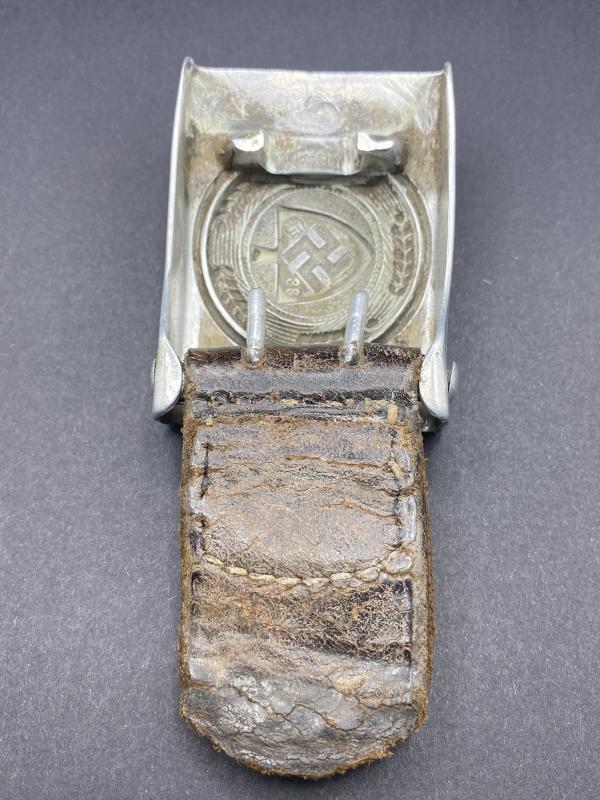 Original 1938 dated Reich Labour front belt buckle in aluminium with brown leather tab. Makers mark on tab hard to read however company logo present on the buckle. Unfortunately the catch to attach to the belt has been sheered off. The buckle still displays well.