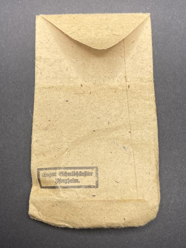Original unissued Black grade wound badge produced by Eugen Schmidthaussler. Award complete with original paper packet. Badge marked E.S.P. Badge may have traces of paper on it due to storage. A nice item. Rarely found in the packet.