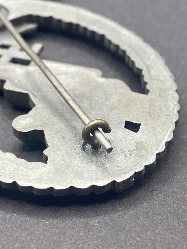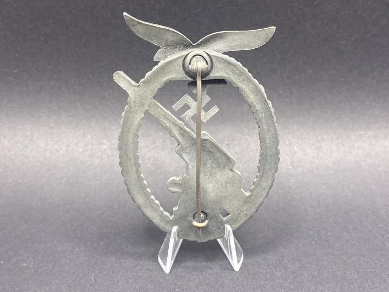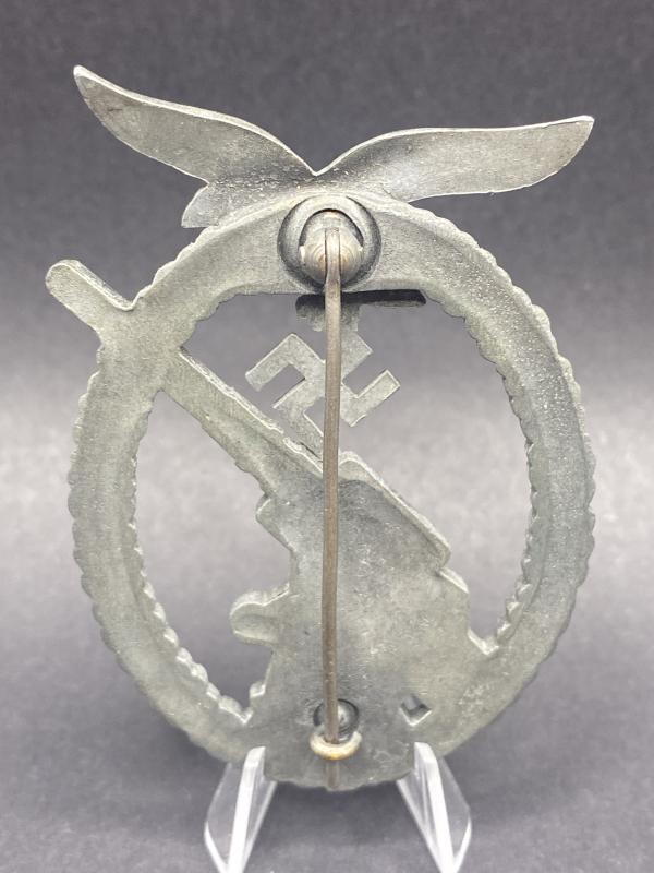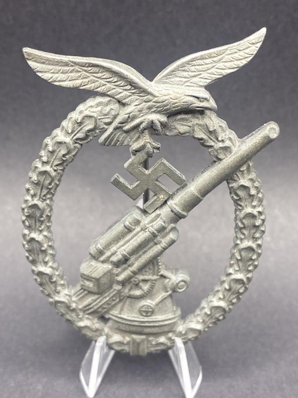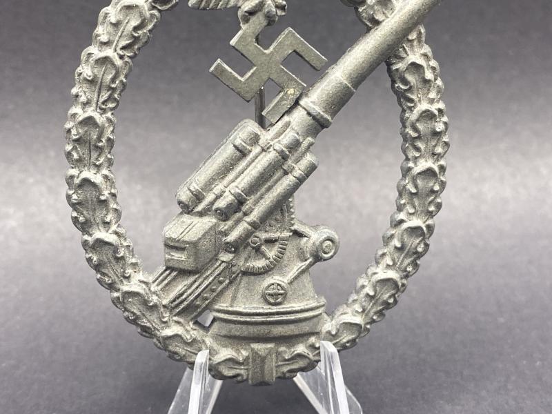 Original Luftwaffe Flak badge produced by an unknown maker with characteristics of the Gablonz makers. Award made of zinc, fitted with ball hinge. A very nice clean badge.