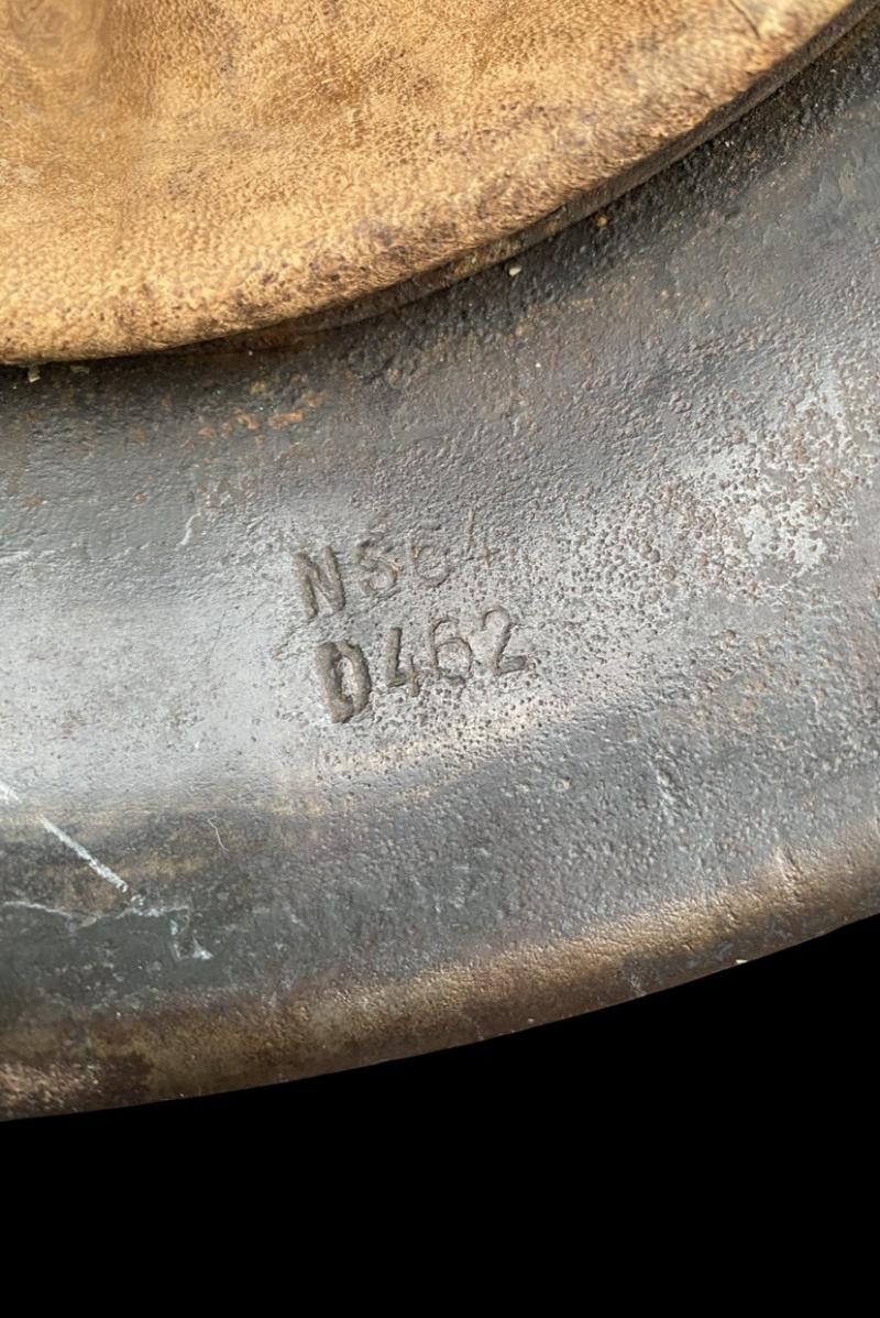 Original late war German M42 helmet complete with liner, shell marks in the rear of the neck NS64 with accompanying batch number of D462. Helmet in fairly good condition, complete with its factory paint however this has worn and a previous owner has laqoured the outer shell giving it a higher shine that it should have. The original factory stamp can be seen in the shell where the crown of the head would sit. This liner is in very good condition, attached to the correct liner band. Liner has had a replacement cord attached inside. Overall a very nice helmet, competitively priced!