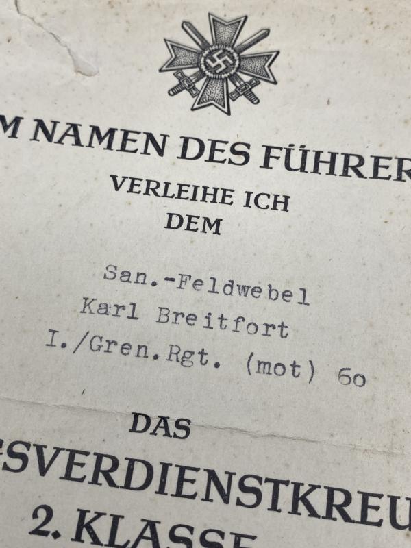 War Merit Cross Second Class Citation San.Feldwebel Karl Breitfort Gren.Rgt.60 (16th Motorized Pz Division “Windhund”)
