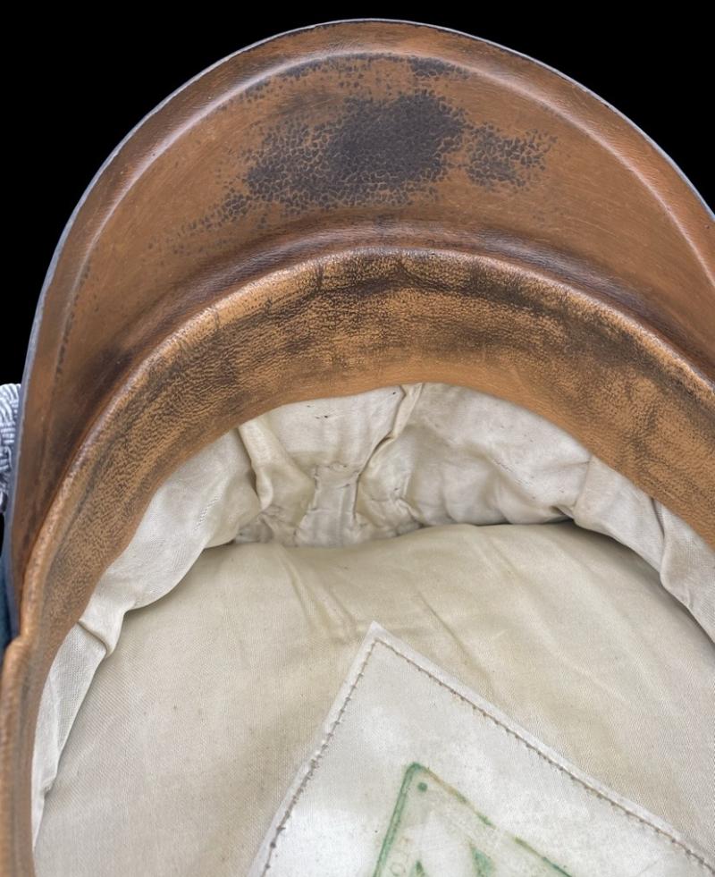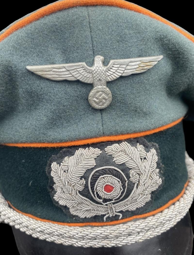 Original German army field police officers visor cap manufactured by August Müller of Munchen. A really well made cap like all other examples surviving from this manufacture. No moth nip or damage to the exterior of the cap, inside the cap the sweat band remains present with an artificial silk liner and celluloid makers stamp. Evidently the eagle appears replaced however the cockade remains original to the cap. A really nice clean item, hard to upgrade with a rare waffenfarbe for field Police. A desirable item for sure!