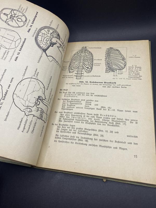 Original DRK first aid manual dated 1942. Denazified front cover however an interesting stamp on the first page indicating this copy was owned by the Waffen SS political training school.