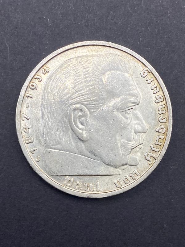 Original circulated 1939 production of a 600 silver five Reichmark coin. Mint code J. In good condition.