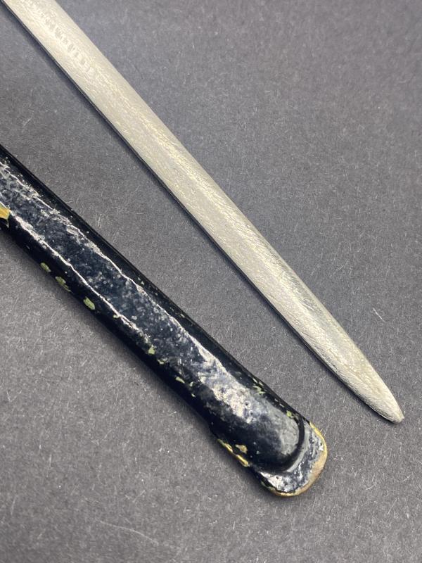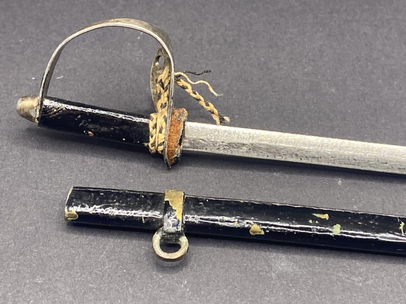 Pretty little miniature letter opener in the appearance of an Imperial German sword. Blade in good condition with painted scabbard. Blade just over four inches long. A nice piece.