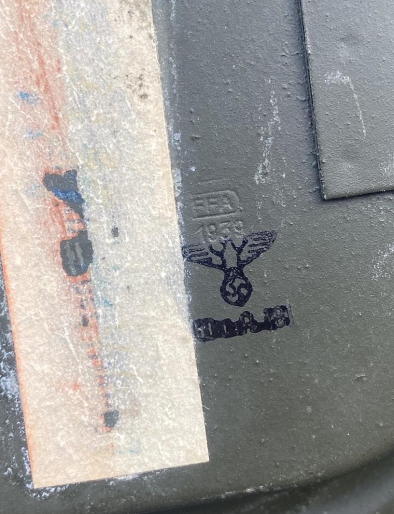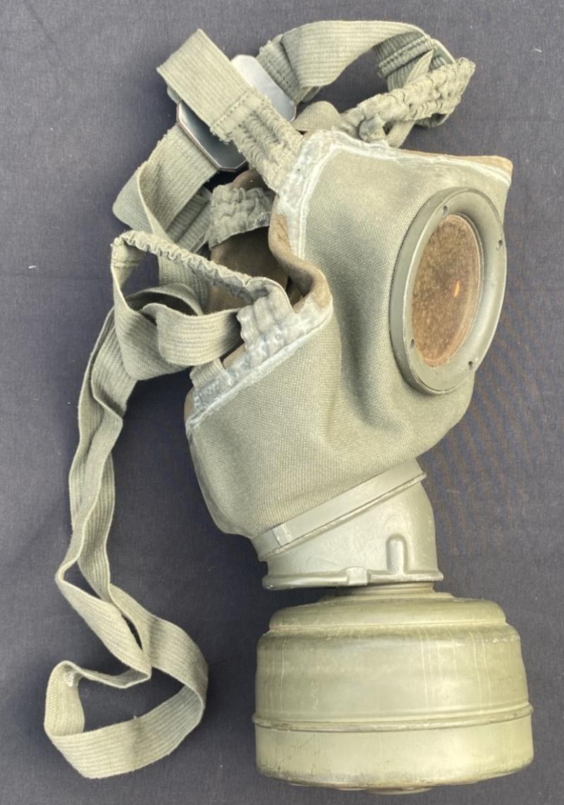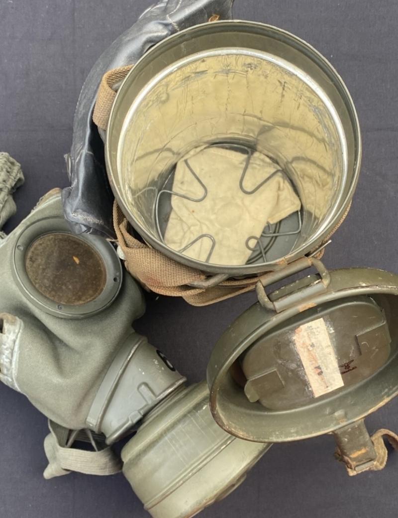 Original complete gas set comprising of the GM30 long gasmask tin, mask, spare lenses, cross strap, gas plane and a pair of RBN numbered utility straps. Mask in good condition complete with all of its accompanying head straps. Tin has some light surface rust. Gas plane pouch is empty but an original wartime production. A very nice set overall.