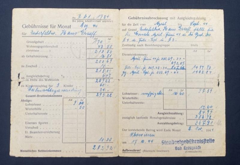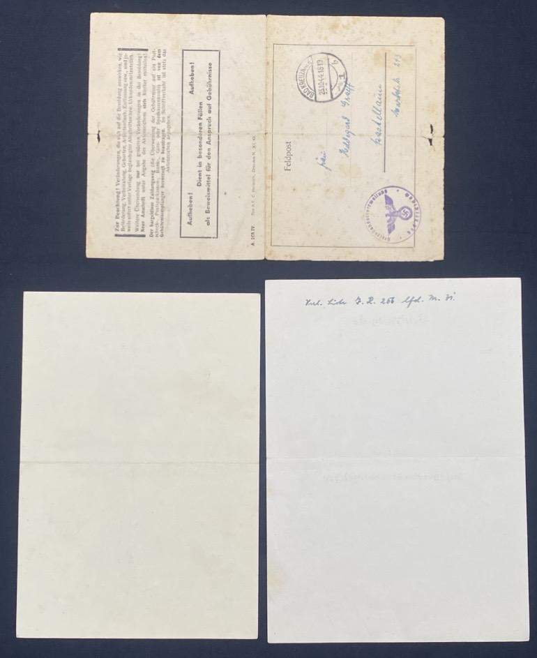 Original German army citations for the Infantry Assault Badge and Black Wound Badge issued to Hans Graff of Infantry Regiment 256 (5th Company). Citations both in good condition with fold creases centrally. Also included is a letter from the German war office to his wife outlining payroll.