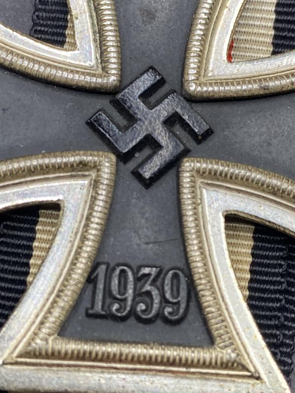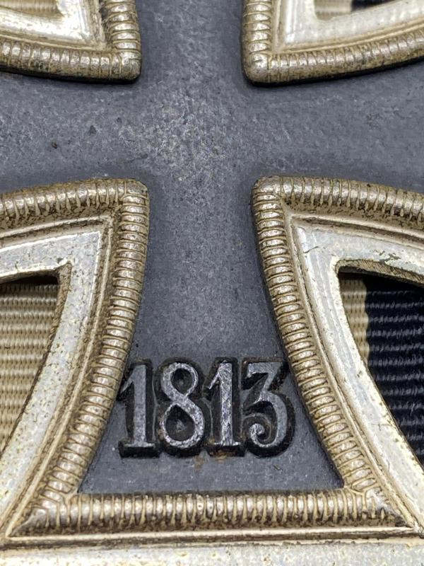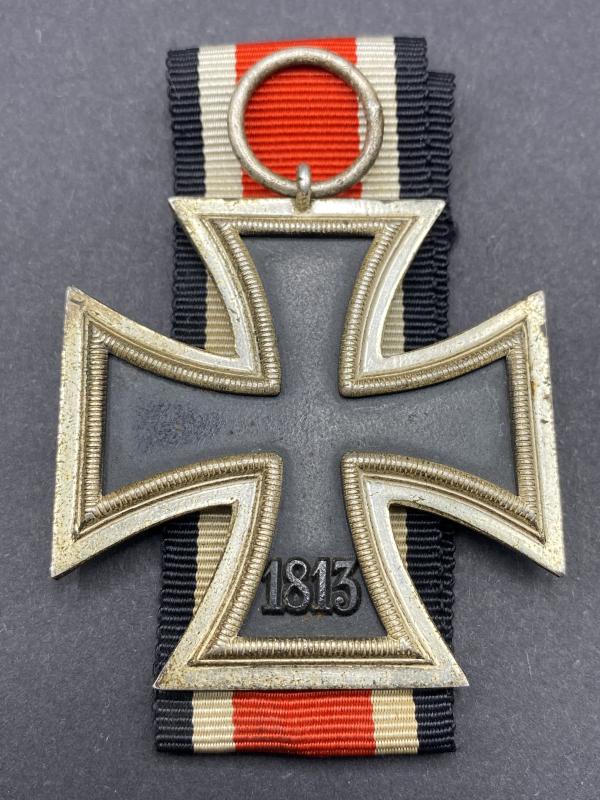 Original unmarked Iron Cross second class complete with ribbon. Typical three piece construction with frosted frame. Good example.