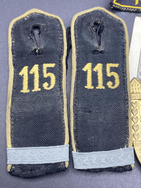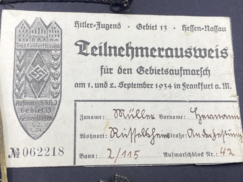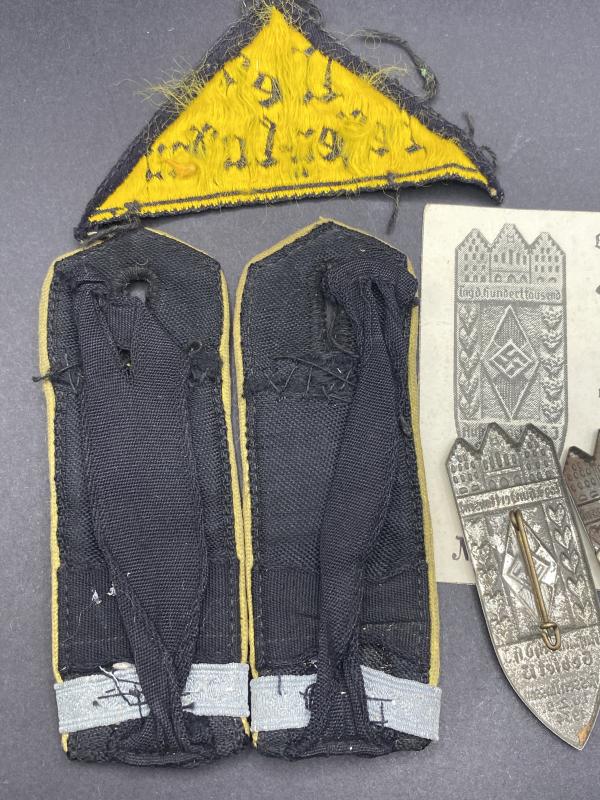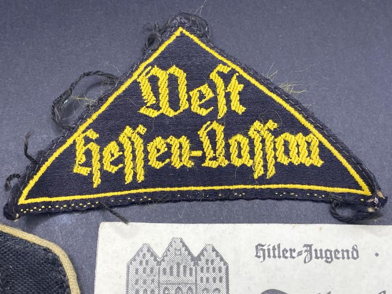 Original HJ West Hessen-Nassau insignia and March badges along with issue card, all from the same HJ member also Included is the 115 regions shoulder boards with yellow piping, alongside the West Hessen-Nassau sleeve patch. A really nice original set.