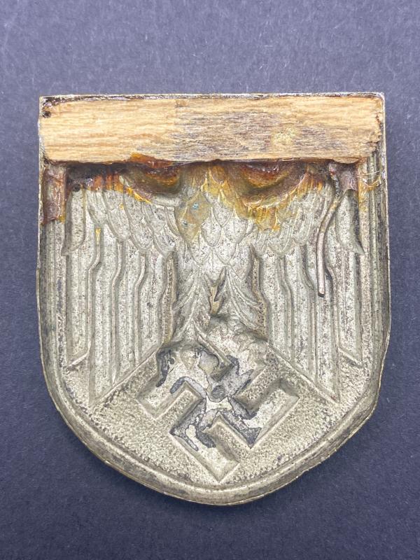 Original German DAK pith helmet shield featuring the state eagle clutching the swastika. Only one pin on the reverse.