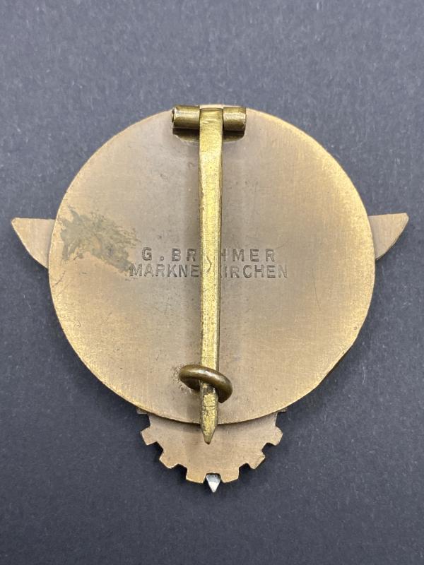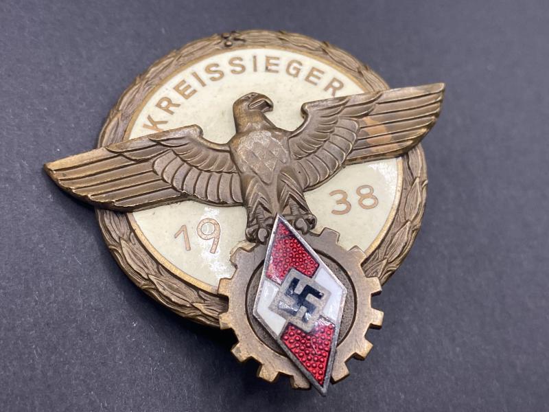 Original Gustav Brehmer made HJ Kreisseiger 1938 badge with perfect enamelling, typical GB design on the reverse. All factory applied hardware without repairs. Really nice example overall.