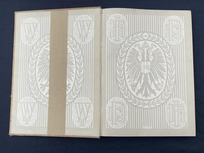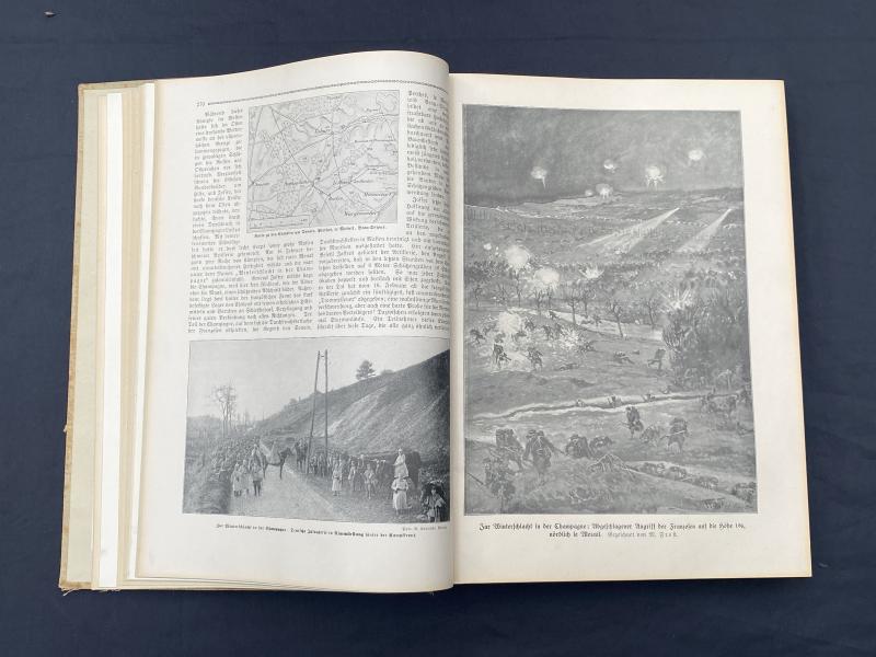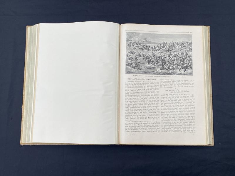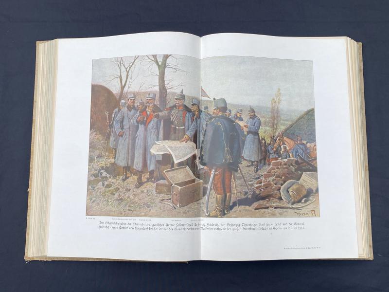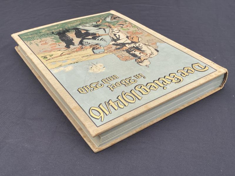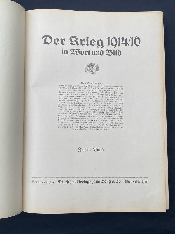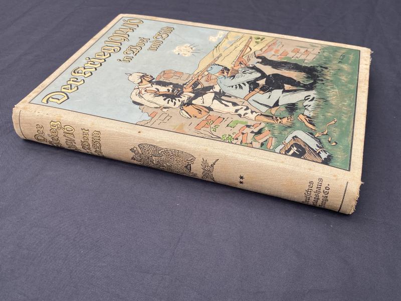 Original print of Der Krieg 1914/16 In Wort und Bild published on behalf of the army by Deutsches Verlagshaus Bong & Co copyright 1916. This book is an in depth summary of the major battles of WW1 fought by Germany up until 1916. All pages present, front cover is printed on canvas as remains in remarkably good condition with great artwork and colours.