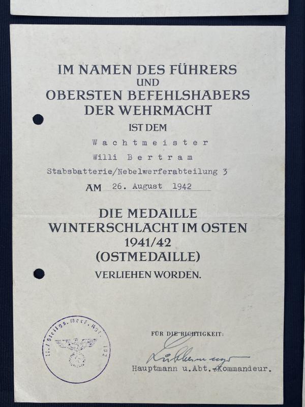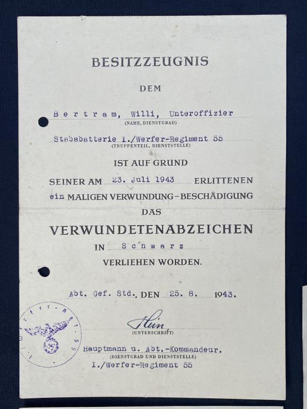 Eastern Front campaign medal when serving with Stabsbatterie/Nebelwerferabteilung 3. Wound badge in black whilst serving in Stabsbatterie I./Werfer-Regt 55. He was promoted to Wachtmeister on the 4th November 1944 whilst serving in Werf.Rgt.102.