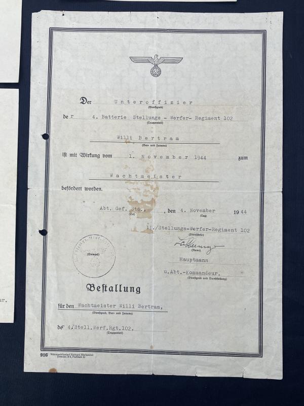 Three Award Citations & Promotion Document Unteroffizier Willi Bertram Nebelwerfer Unit
