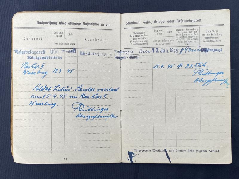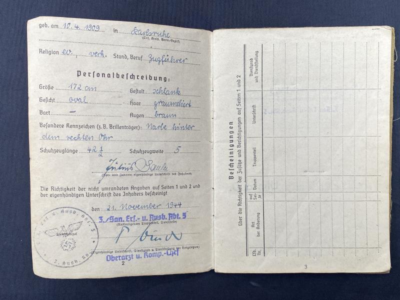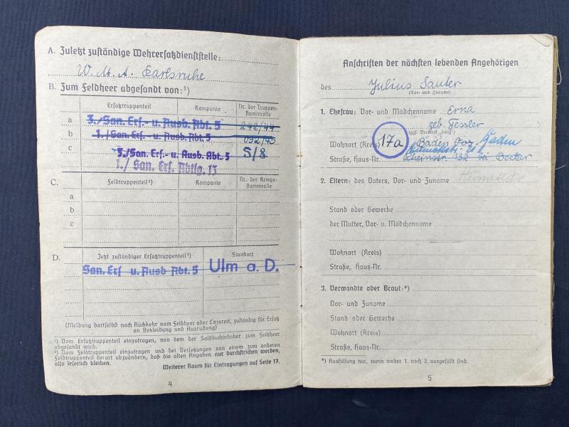 German Army Soldbuch Soldat Julius Sauter KIA April 1945 3./San.Ers.Aus.Abt.5.