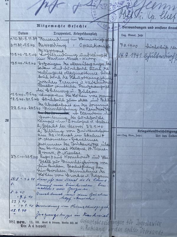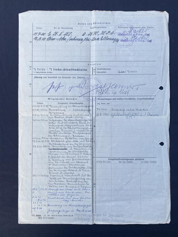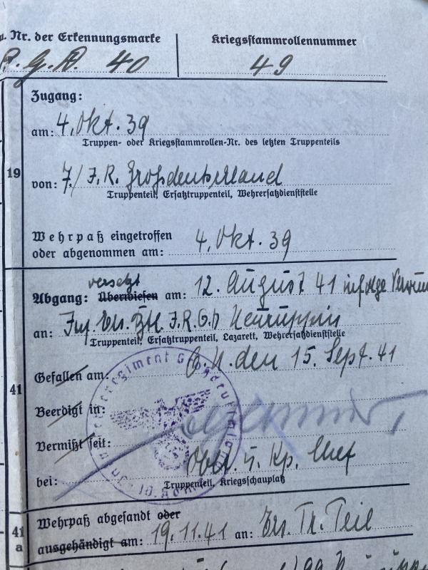 Original replacement Soldbuch papers for a Grenadier of Großdeutschland Division (Max Fehluer). First side gives details like his name, next of kin, unit & Erkennungsmarke details as well as promotions and address. The reverse notes awards, hospital costs and operational history of his until.
