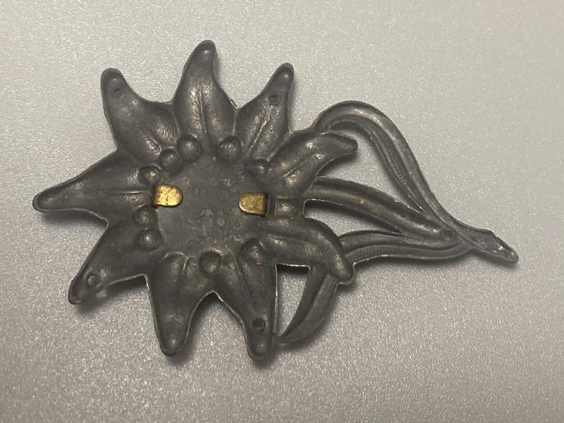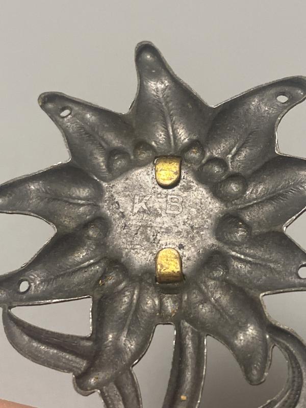 Original German mountain troops metal cap badge. In good condition, maker marked faintly “KB”.