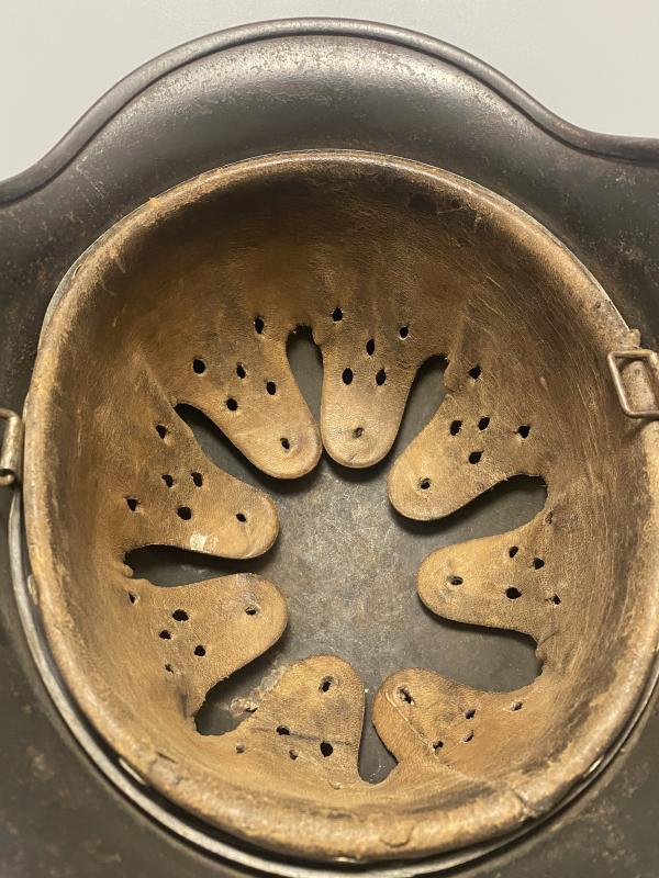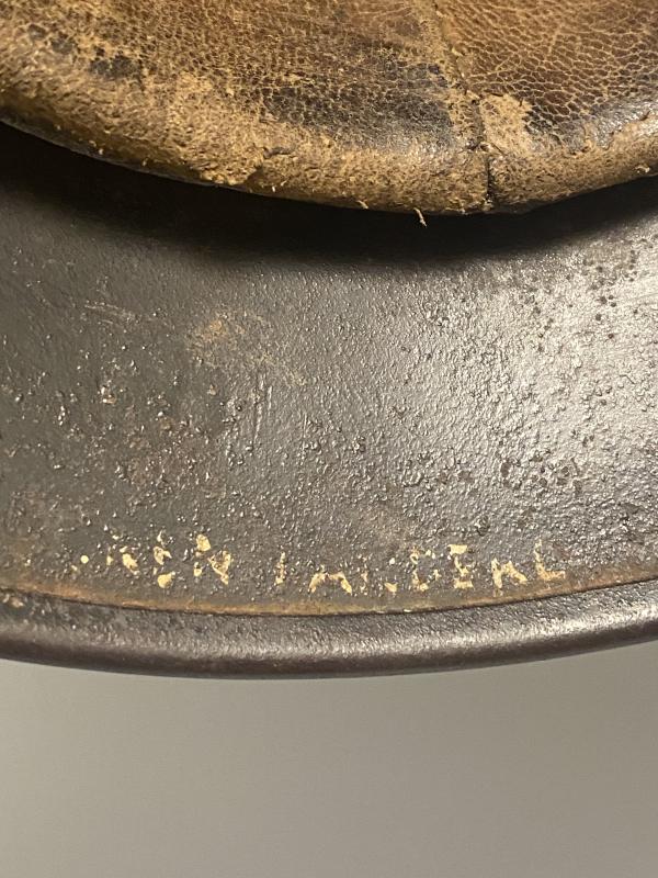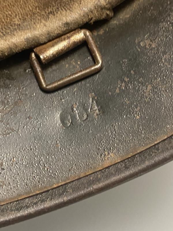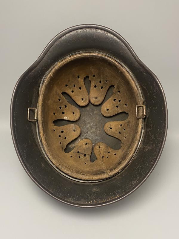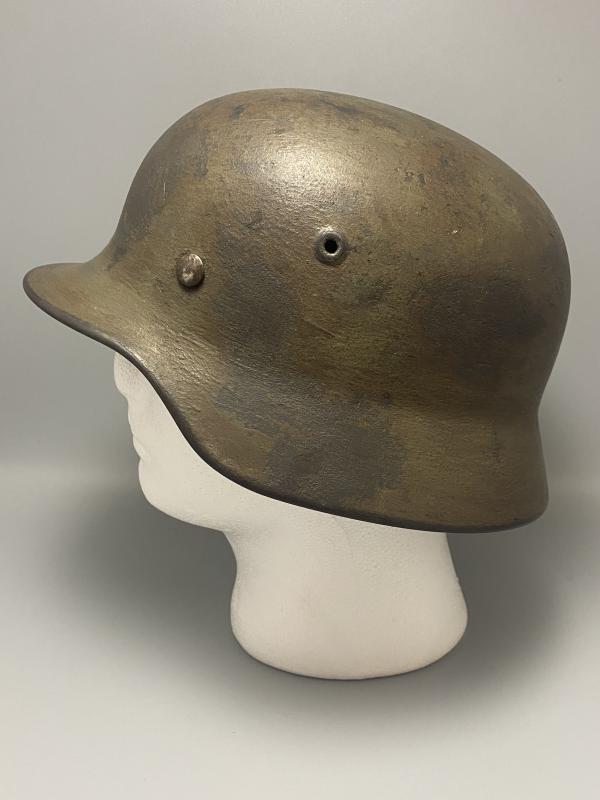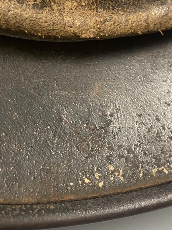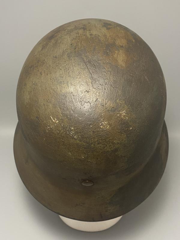 Original Luftwaffe M40 helmet in two tone camouflage. No traces of decals appear underneath the paint, thick hand applied splotches. Shell made by Quist size 64 with a 56/57 liner. Liner band and leather original to the shell. Two of the three split pins are unmolested and the other has been moved at some point. Faint batch number present in the shell reading three digits, ending in a 3. The first two digits are ineligible. Underneath the batch number a name is present which is also difficult to read. A really nice original helmet.